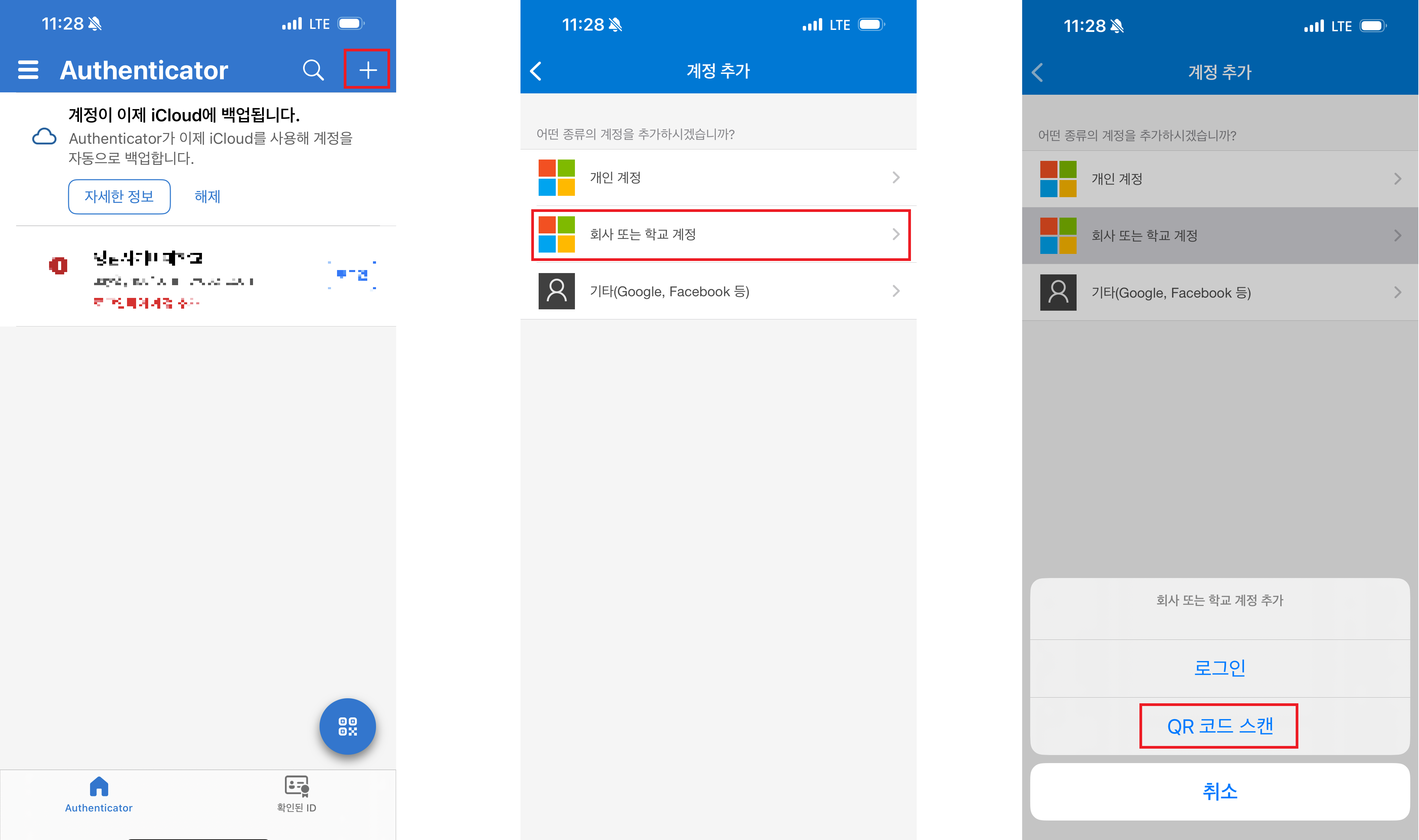4.QRÄڵ尡 ³ª¿Ô´Ù¸é, ½ÇÇàÁßÀÎ ¾îÇÿ¡¼ ¿ìÃø»ó´ÜÀÇ [+] ¹öưÀ» ´©¸¥ µÚ, ȸ»ç ¶Ç´Â Çб³ °èÁ¤À» ¼±ÅÃÇϰí QR ÄÚµå ½ºÄµÀ» ¼±ÅÃÇÕ´Ï´Ù